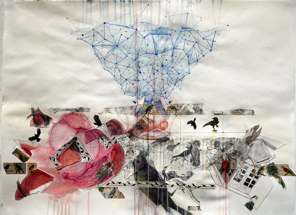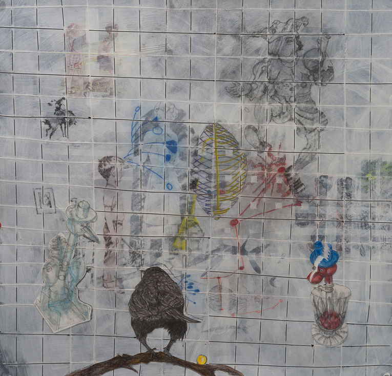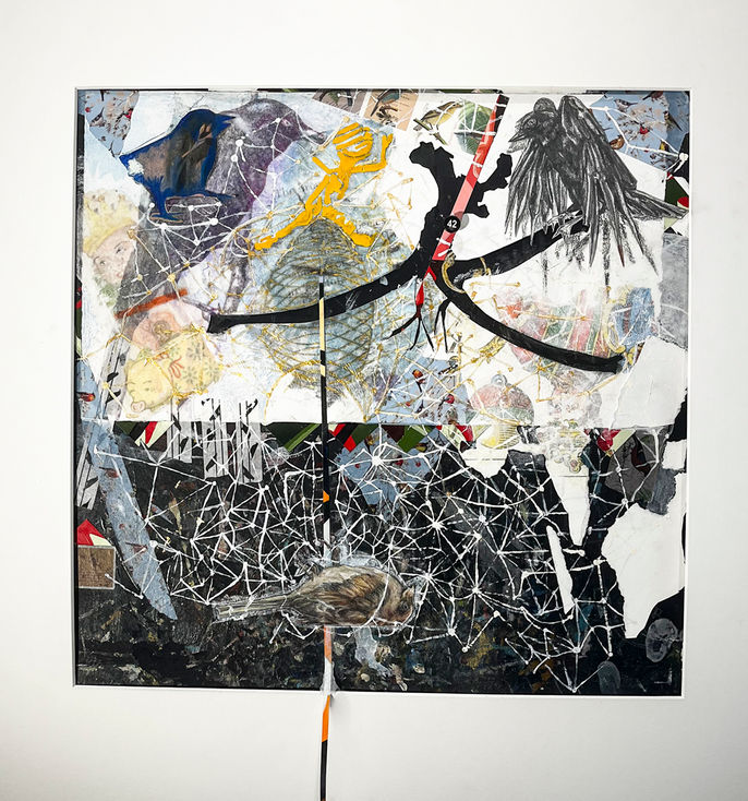 The Yellow King:2.0 continues the narrative of “The Yellow King”. The newer works Intertwine with the visual motifs of “The Yellow King “through intricate grid patterns, meticulously crafted to delineate the boundaries between the realms of the real and the imaginary. These grids serve as metaphors for the barriers that separate us from one another, highlighting the pervasive divisions that perpetuate strife and alienation. Embedded within the grided system of my work are symbols of neurons and gravity, signs that speak to the intricate web of connections that bind us together and the inexorable forces that shape our reality. Through these signs, I seek to explore the complexities of human consciousness and the gravitational pull of our darkest impulses. Finally, drawing inspiration from the subversive subculture of motorcycle gangs in the 1950s, I have created an interpretation of a specific bird, the Grackle. By labeling the Grackles as motorcycle birds, I delve into the psychology of group dynamics and the allure of belonging. Through this lens, I interrogate the seductive power of gang mentality and the insidious ways in which it perpetuates violence and exclusion.